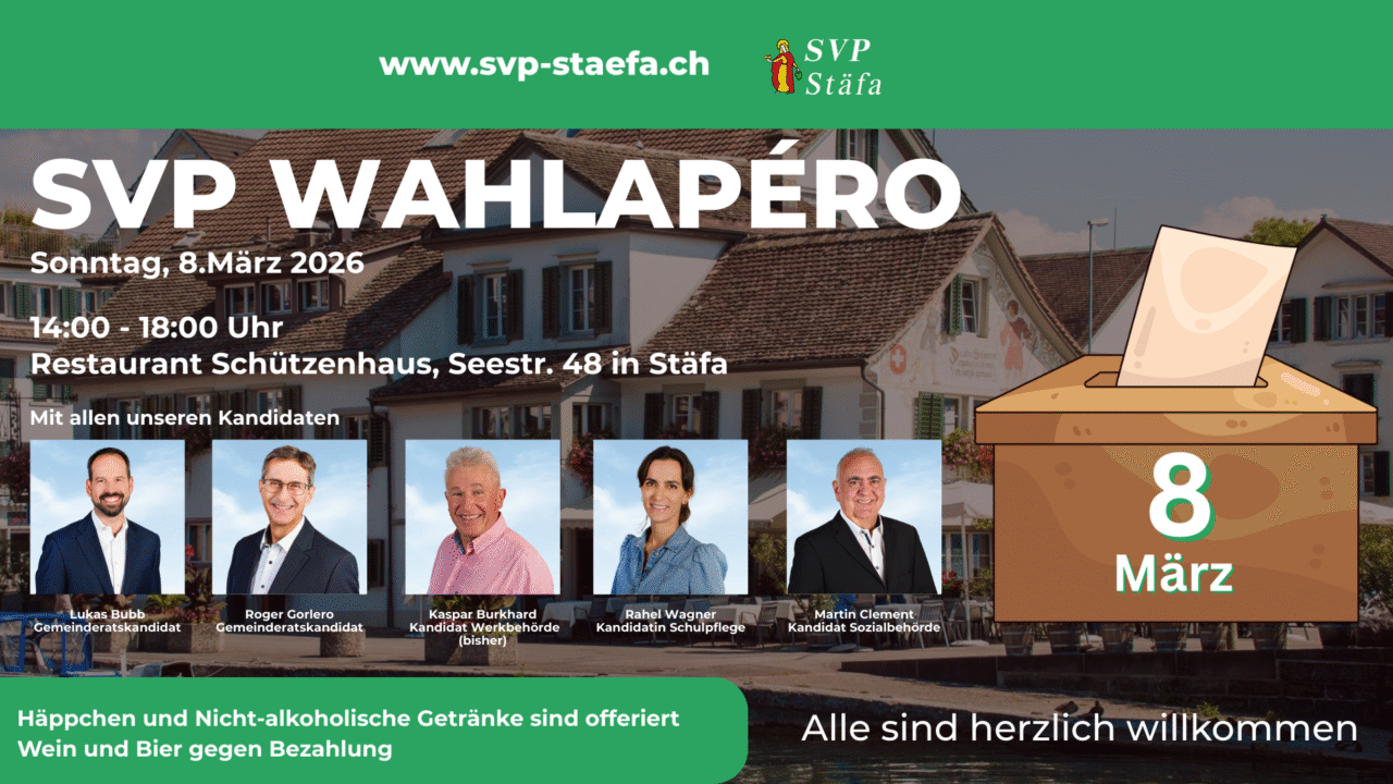 Im Anschluss an den Urnengang lädt die SVP Stäfa herzlich zum Wahlapéro ein. Nutzen Sie die Gelegenheit für einen direkten Austausch, gute Gespräche und Ihre Fragen an die Kandidatinnen und Kandidaten der SVP Stäfa. Wir freuen uns auf viele Begegnungen und einen lebendigen Wahlsonntag.